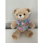 This Teddy Bear has a happy disposition. Sandy brown fur from head to foot. Dark brown colored footprints match has large nose. A printed ribbon is tied around his neck.